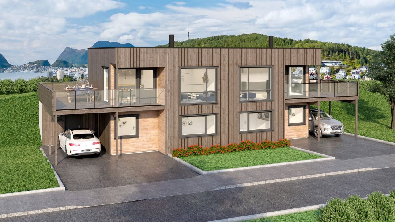 Bolig 1103 er en vertikaldelt tomannsbolig som egner seg for skrå tomter. Det er to soverom i første etasje og ett soverom/TV stue andre etasje. Fra kjøkkenet har du tilgang til en stor veranda på nesten 30m2. Boligen har egen carport, sportsbod og inngangsparti som er plassert under veranda. Noe som gir god skjerming mot vær og vind ved boligens inngangsparti.