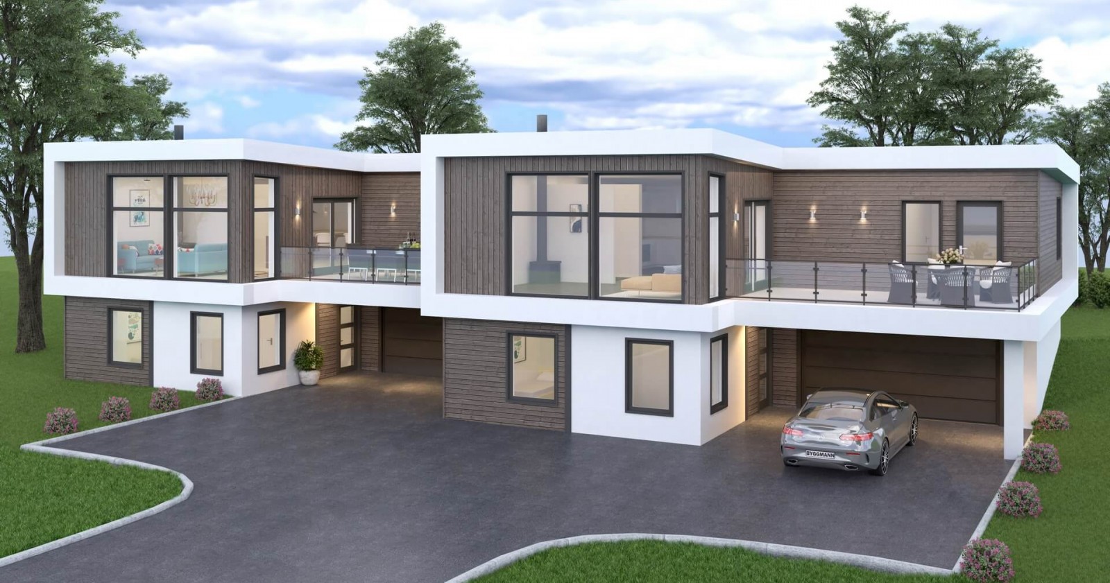 Bolig 1104 er en tomannsbolig litt utenom det vanlige. Materialene har blir satt sammen for å skape en spennende fasade. Boligen er beregnet for skrå utsiktstomter og enhetene har blant annet en integrert romslig garasje. Fra kjøkkenet har man direktetilgang til terreng på ene siden av bygget, mens man fra soverom og stue har tilgang til terrasse.